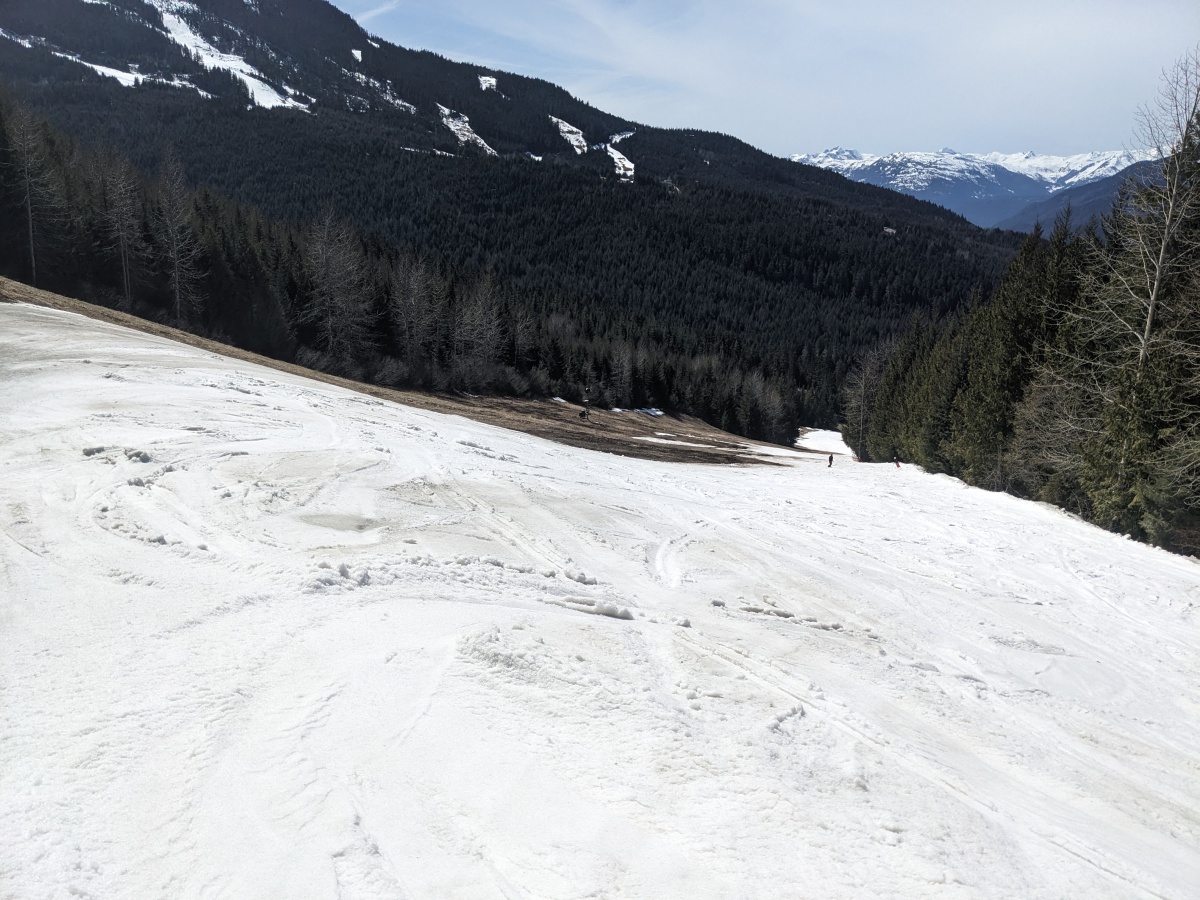Blackcomb-only day, with the resort opening at 9:00am this week instead of 8:30am. It was a hot, sunny, 11C slushy day.